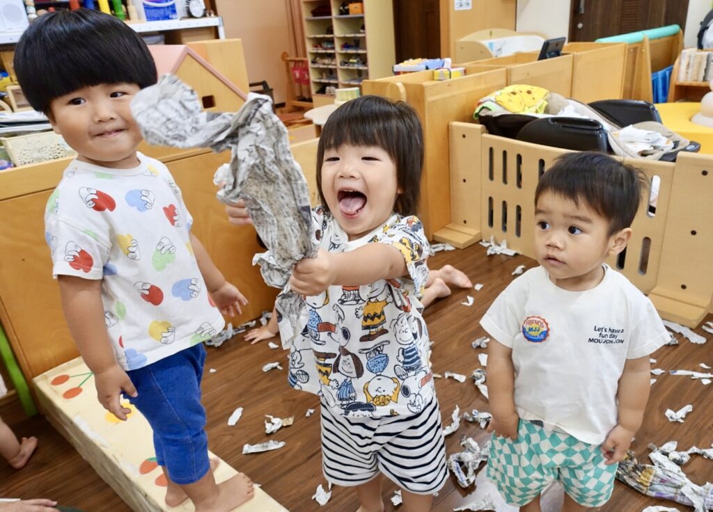室内遊び♪ 2025.08.20 } ?> } ?> } ?> 暑い日が続くものの、お盆休み明けみんな元気です✨ 室内遊びでは 新聞紙を使ってはしゃいでました♪ 電車もみんな大好き! 今日もたくさん遊んで、食べて、お昼寝もぐっすりです。