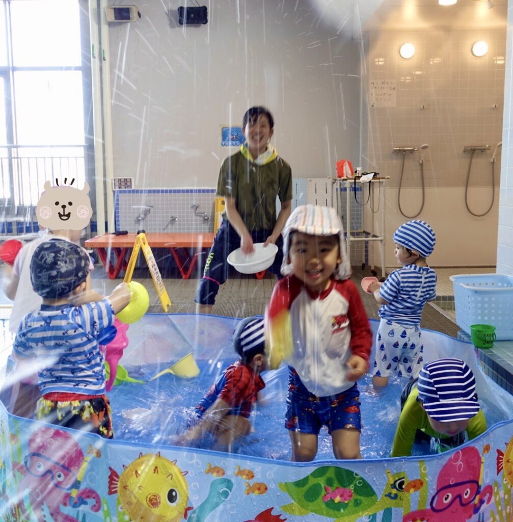 かわいい(かっこいい)水着を着て、プールサイドの小さいプールで遊びます✨