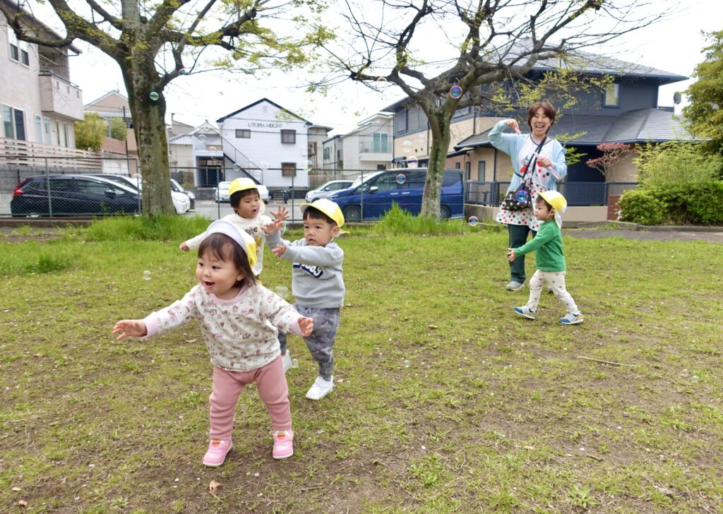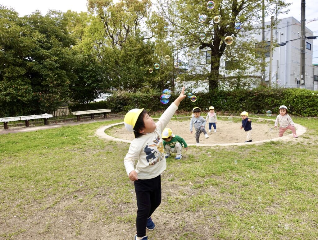 先生が飛ばすキラキラふわふわ空中に浮かぶしゃぼん玉を追いかけました😆